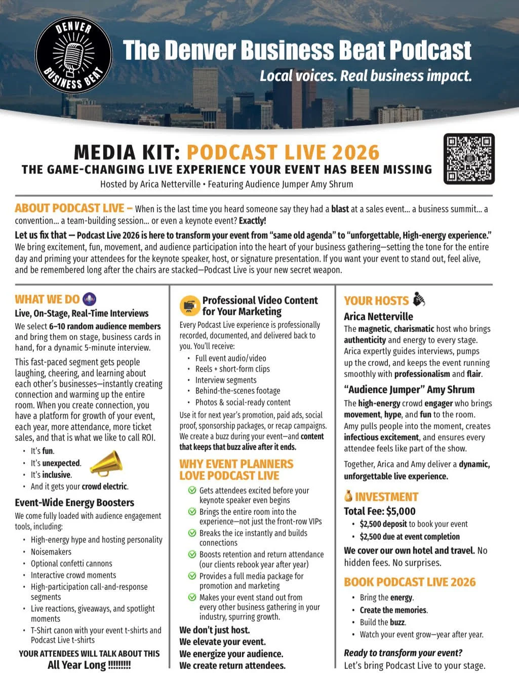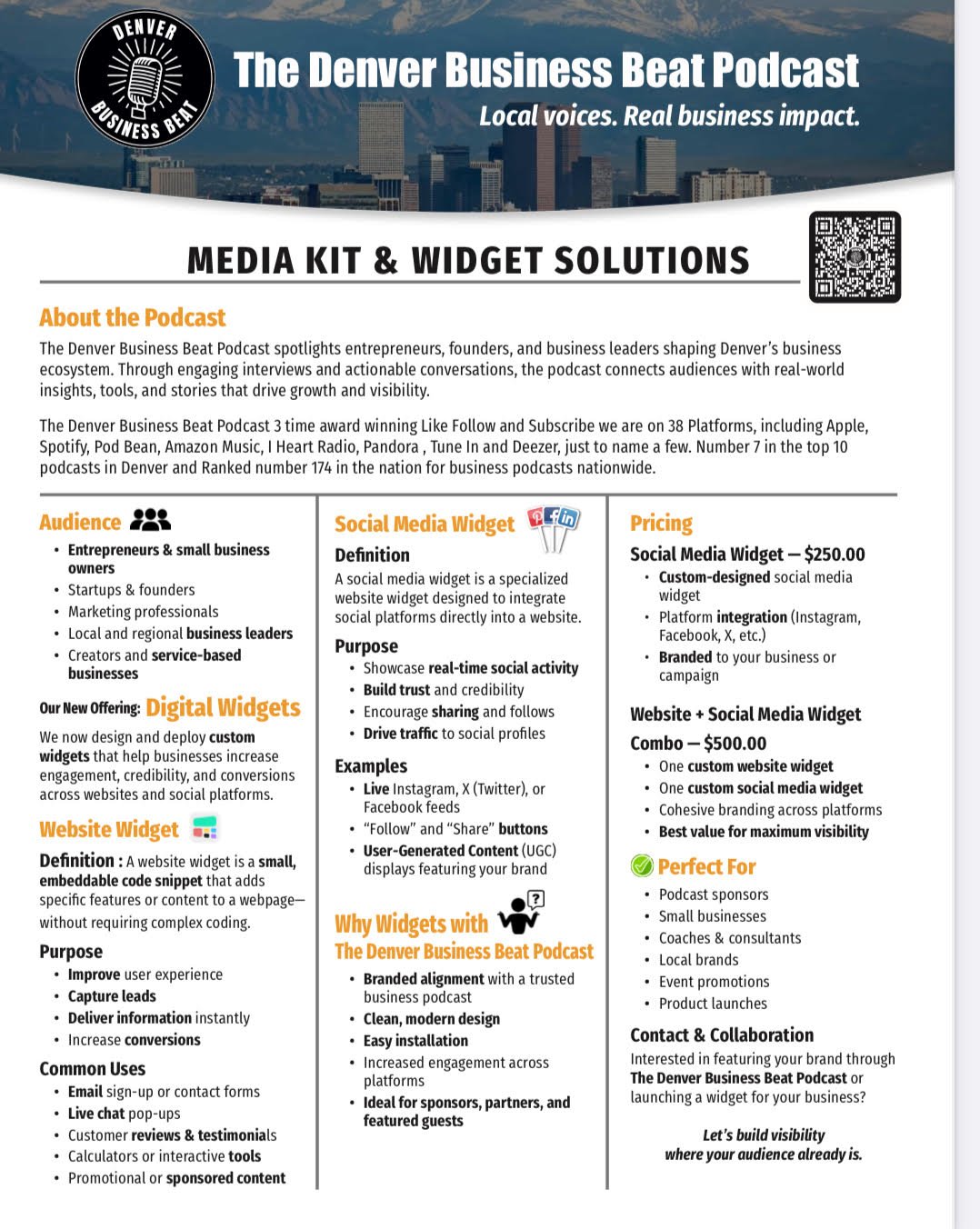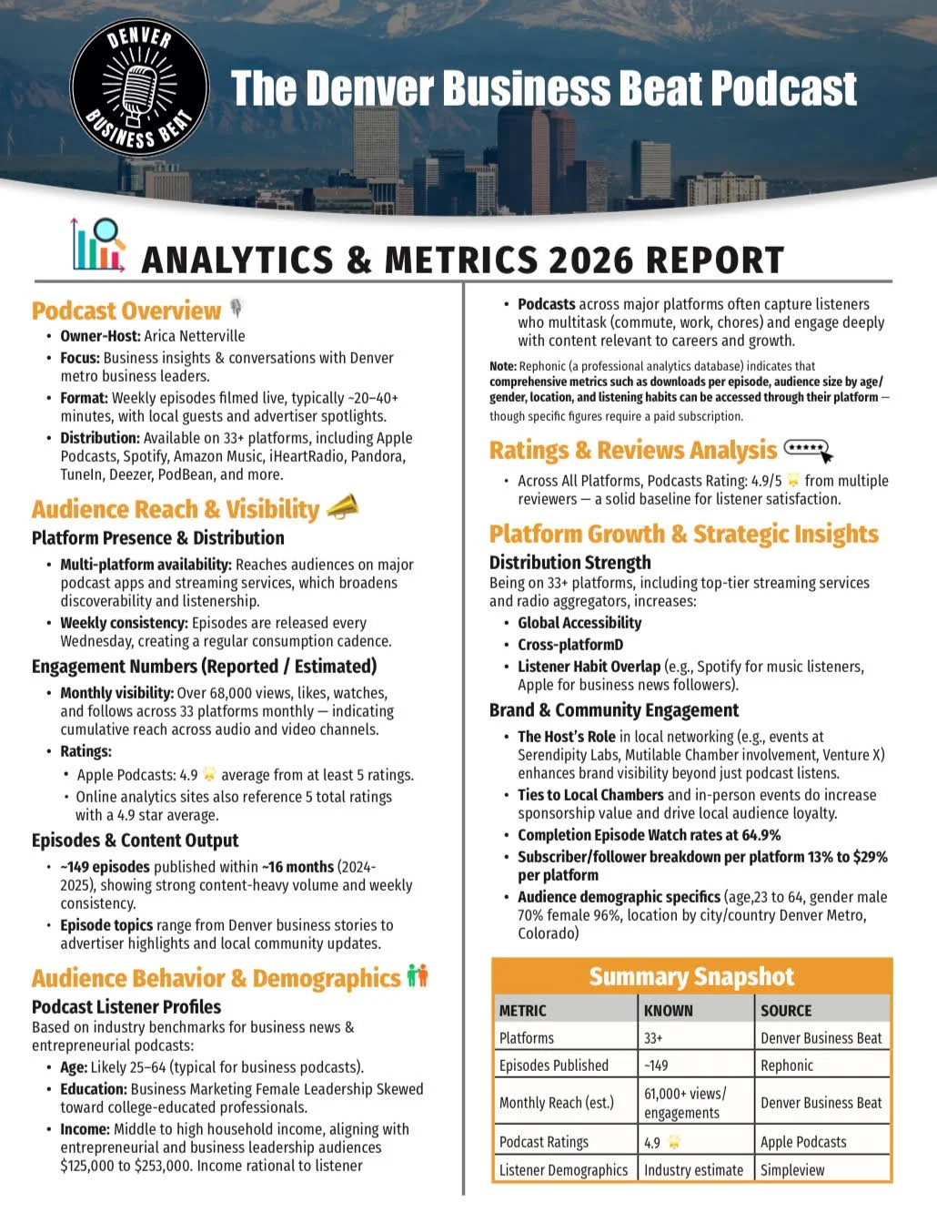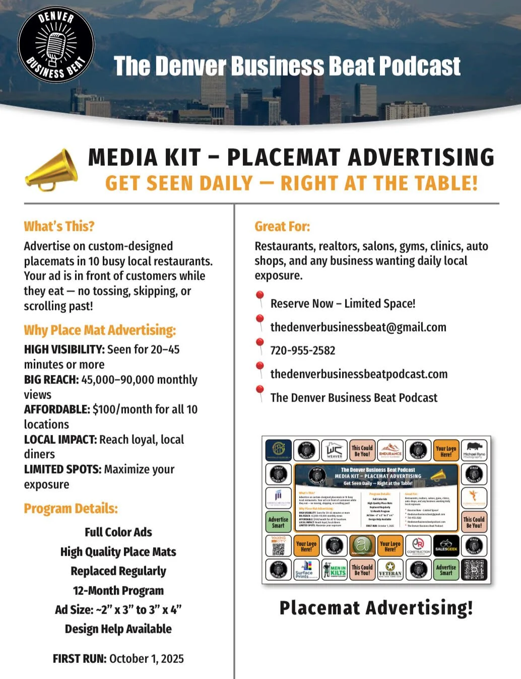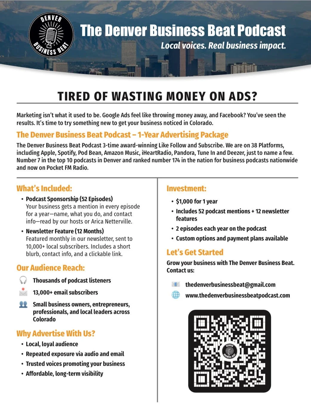 The Denver Business Beat Podcast 3-time award-winning Like Follow and Subscribe. We are on 38 Platforms, including Apple, Spotify, Pod Bean, Amazon Music, iHeartRadio, Pandora, Tune In and Deezer, just to name a few. Number 7 in the top 10 podcasts in Denver and ranked number 174 in the nation for business podcasts nationwide. Website www.thedenverbusinessbeatpodcast.com
